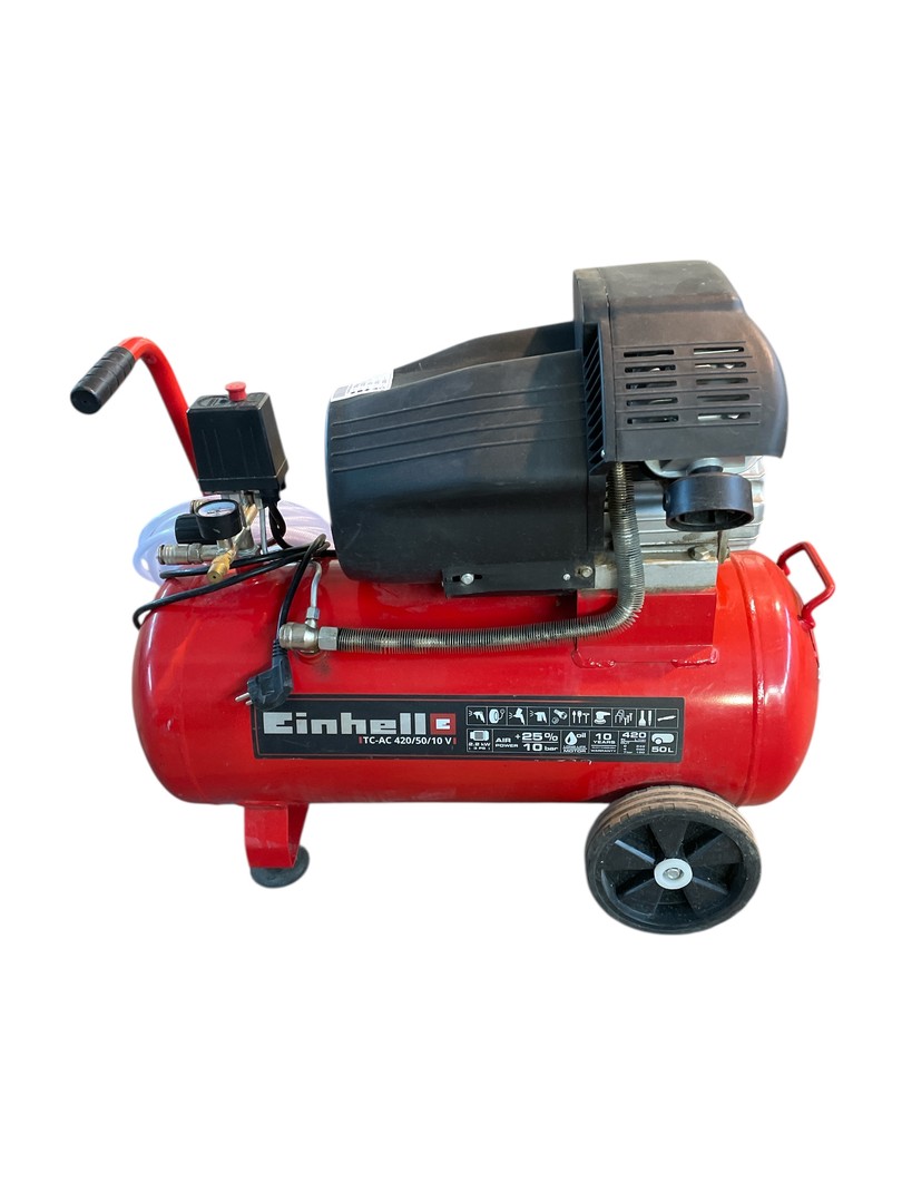 Einhell Kompresor TC-AC 420/50/10 V to profesjonalne urządzenie o mocy 2.200 W i maksymalnym ciśnieniu 10 bar. Dzięki wydajnej podwójnej sprężarce oraz 50-litrowemu zbiornikowi, masz wystarczającą rezerwę powietrza do wielu zastosowań.